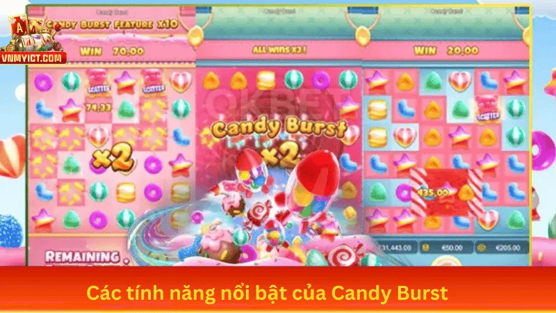 Candy Burst không chỉ dừng lại ở cơ chế quay hũ truyền thống mà còn được trang bị nhiều tính năng đặc biệt giúp tăng cơ hội chiến thắng cho người chơi. Những tính năng này bao gồm: