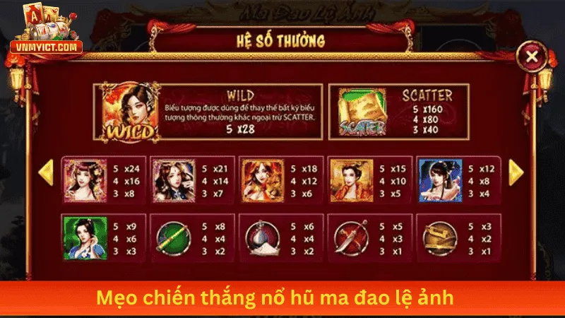 Nổ hũ ma đao lệ ảnh tại VNMyict mang đến cho người chơi không chỉ là cơ hội giải trí mà còn là cơ hội nhận những phần thưởng lớn hấp dẫn. Với luật chơi đơn giản, các biểu tượng đặc biệt cùng các chiến thuật chơi hiệu quả, bất kỳ ai cũng có thể tham gia và thử vận may của mình. Hãy đăng ký tài khoản tại VNMyict ngay hôm nay để trải nghiệm nổ hũ ma đao lệ ảnh và khám phá những khoảnh khắc thú vị cùng cơ hội đổi đời từ trò chơi slot game đỉnh cao này.